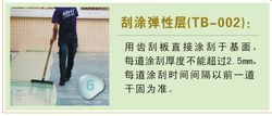 加強層(TB-003)為單組份吸水材料,用膠刮板分1~2道直接刮涂于修整好的彈性層面上,必須******刮涂后表面光滑平整,每道涂刮時間間隔以前一道干固為準(一般約10小時,具體視現(xiàn)場天氣情況而定)直至涂刮至所需厚度。若氣溫較低(<12℃)以及相對濕度較低(<60%),需加入2~5%水攪拌均勻后涂刮,以加速材料固化,減少間隔時間,具體加水量視現(xiàn)場天氣而定。若氣溫較低,涂料稠度增加時,可加入適量稀釋劑調(diào)節(jié)施工稠度。應避免在高溫烈日下施工,施工后應保持2~3小時不受猛烈陽光照射,否則因表面成型太快會造成表面鼓泡。在施工過程中若有雜物混入或刮涂有不平整處需修整平滑后才能進行面層施工。
